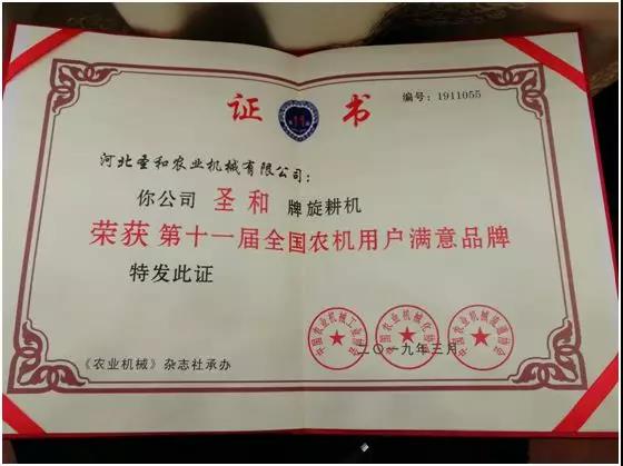 圣和公司生產(chǎn)的旋耕機(jī)榮獲“第十一屆全國農(nóng)機(jī)用戶滿意品牌"大獎(jiǎng)!