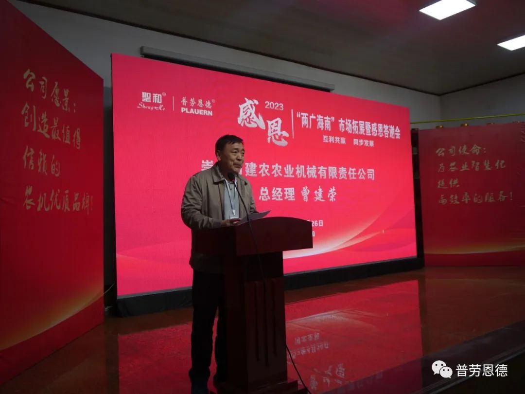 廣西崇左市建農(nóng)農(nóng)業(yè)機(jī)械有限責(zé)任公司總經(jīng)理曾建榮作為經(jīng)銷商代表進(jìn)行了發(fā)言。曾總分析了廣西農(nóng)業(yè)種植結(jié)構(gòu)和農(nóng)機(jī)市場,希望圣和公司憑借其強(qiáng)大的公司實(shí)力和研發(fā)能力,開發(fā)出適合當(dāng)?shù)馗鞯男缕窓C(jī)具,以填補(bǔ)市場空白。