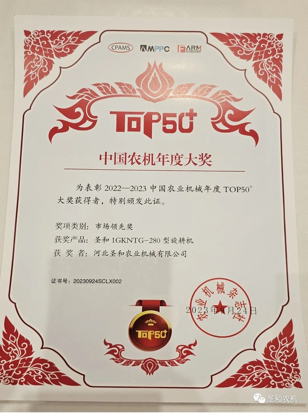 喜報頻傳獲佳績 奮楫揚帆正當時----圣和牌旋耕機再度榮獲“市場領先”獎