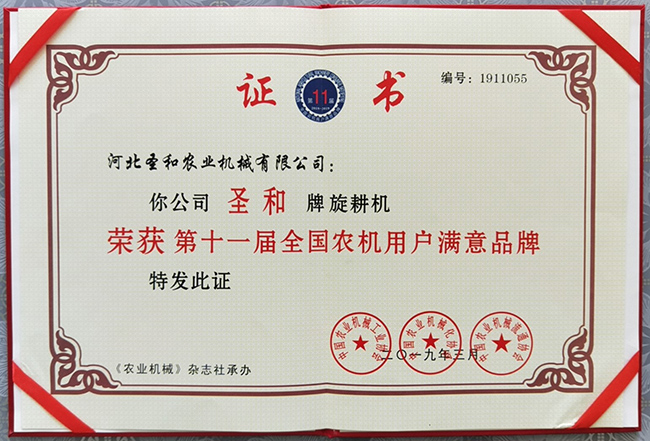 圣和旋耕機(jī)榮獲第十一屆滿意品牌證書