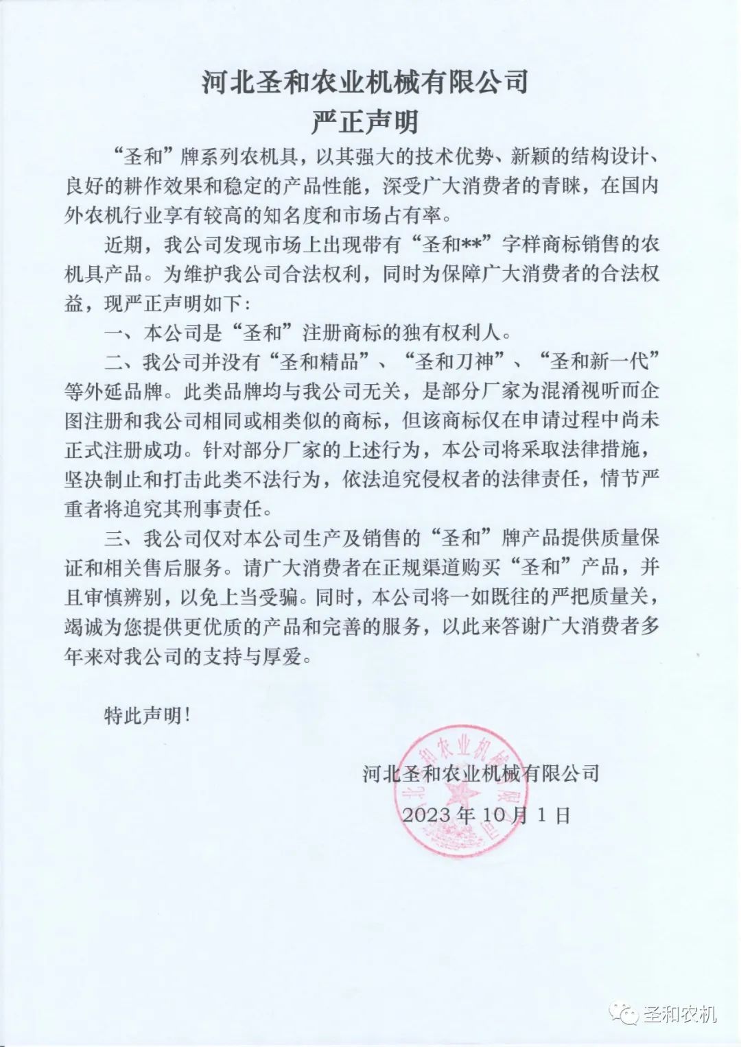 “圣和”牌系列農(nóng)機(jī)具,以其強(qiáng)大的技術(shù)優(yōu)勢(shì)、新穎的結(jié)構(gòu)設(shè)計(jì)、良好的耕作效果和穩(wěn)定的產(chǎn)品性能,深受廣大消費(fèi)者的青睞,在國(guó)內(nèi)外農(nóng)機(jī)行業(yè)享有較高的知名度和市場(chǎng)占有率。 近期,我公司發(fā)現(xiàn)市場(chǎng)上出現(xiàn)帶有“圣和**”字樣商標(biāo)銷(xiāo)售的農(nóng)機(jī)具產(chǎn)品。為維護(hù)我公司合法權(quán)利,同時(shí)為保障廣大消費(fèi)者的合法權(quán)益,現(xiàn)嚴(yán)正聲明如下: 一、本公司是“圣和”注冊(cè)商標(biāo)的獨(dú)有權(quán)利人。 二、我公司并沒(méi)有“圣和精品”、“圣和刀神”、“圣和新一代”等外延品牌。此類(lèi)品牌均與我公司無(wú)關(guān),是部分廠家為混淆視聽(tīng)而企圖注冊(cè)和我公司相同或相類(lèi)似的商標(biāo),但該商標(biāo)僅在申請(qǐng)過(guò)程中尚未正式注冊(cè)成功。針對(duì)部分廠家的上述行為,本公司將采取法律措施,堅(jiān)決制止和打擊此類(lèi)不法行為,依法追究侵權(quán)者的法律責(zé)任,情節(jié)嚴(yán)重者將追究其刑事責(zé)任。 三、我公司僅對(duì)本公司生產(chǎn)及銷(xiāo)售的“圣和”牌產(chǎn)品提供質(zhì)量保證和相關(guān)售后服務(wù)。請(qǐng)廣大消費(fèi)者在正規(guī)渠道購(gòu)買(mǎi)“圣和”產(chǎn)品,并且審慎辨別,以免上當(dāng)受騙。同時(shí),本公司將一如既往的嚴(yán)把質(zhì)量關(guān),竭誠(chéng)為您提供更優(yōu)質(zhì)的產(chǎn)品和完善的服務(wù),以此來(lái)答謝廣大消費(fèi)者多年來(lái)對(duì)我公司的支持與厚愛(ài)。