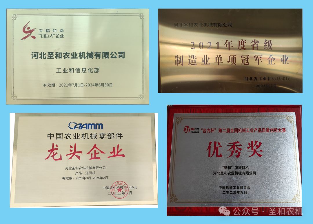 公司被授予國家級專精特新“小巨人”企業(yè)、河北省“專精特新”示范企業(yè)、河北省耕作機械技術創(chuàng)新中心依托單位、省級制造業(yè)單項冠軍企業(yè)、河北省首批縣域特色產(chǎn)業(yè)集群“領跑者”企業(yè)名單。身處行業(yè)當中,圣和公司積極參與和承擔行業(yè)、協(xié)會等發(fā)起各項產(chǎn)品的標準起草編寫工作,推動了行業(yè)發(fā)展。