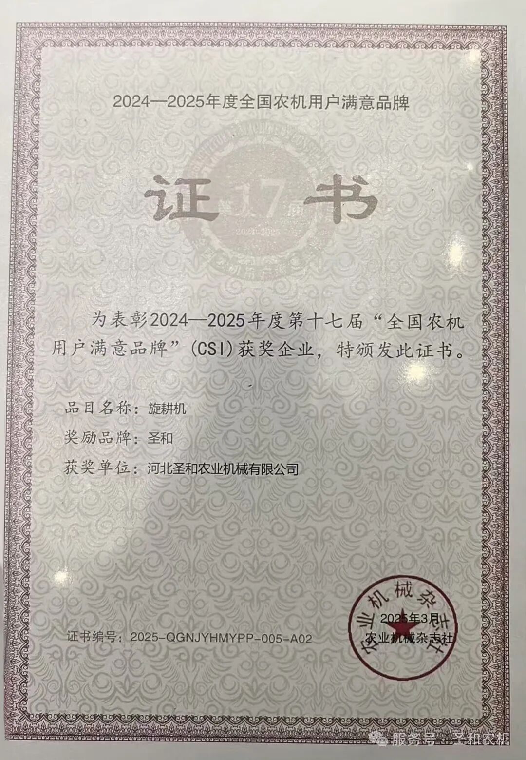 3 月至 5 月,圣和品牌迎來(lái)榮譽(yù) “雙豐收”!3 月 7 日,“圣和牌旋耕機(jī)” 在全國(guó)農(nóng)機(jī)品牌大會(huì)上連續(xù)多年斬獲 “全國(guó)農(nóng)機(jī)用戶滿意品牌”,用千萬(wàn)農(nóng)戶的口碑印證產(chǎn)品硬實(shí)力;5 月 10 日中國(guó)品牌日當(dāng)天,圣和公司再添重磅榮譽(yù),榮膺河北省 “行業(yè)領(lǐng)航品牌” 稱號(hào)!雙榮譽(yù)加身,不僅是對(duì)圣和深耕農(nóng)機(jī)領(lǐng)域多年的極致認(rèn)可,更彰顯了其引領(lǐng)行業(yè)發(fā)展、踐行品牌強(qiáng)國(guó)戰(zhàn)略的絕對(duì)實(shí)力,未來(lái)品牌影響力將持續(xù)輻射全國(guó)、走向世界!