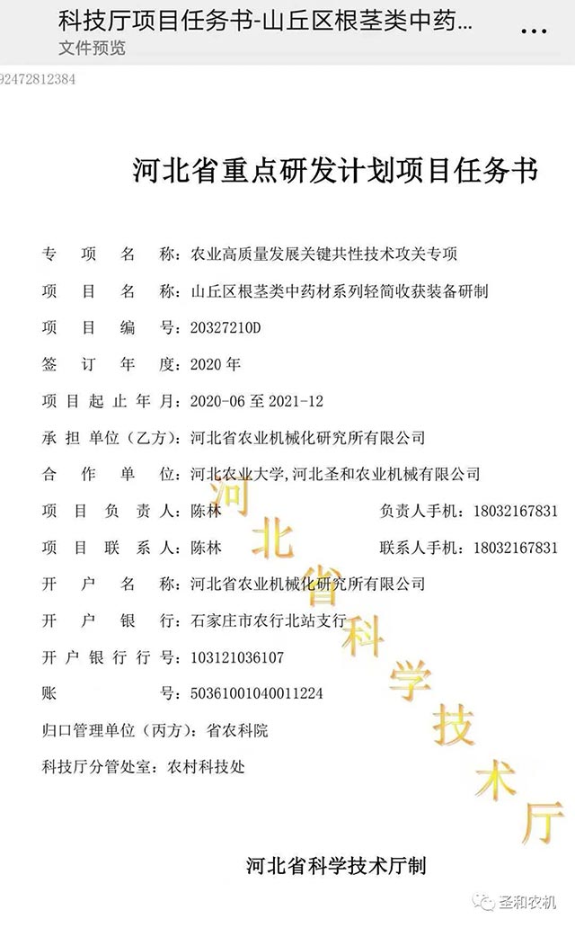 河北省重點研發(fā)計劃項目:山丘區(qū)根莖類中藥材系列輕簡收獲裝備研制項目,由河北省農業(yè)機械化研究所有限公司承擔,河北農業(yè)大學與河北圣和農業(yè)機械有限公司為合作單位。 本次會議河北省農業(yè)機械化研究所所長范國昌,河北圣和農業(yè)機械有限公司董事長王新芳等參加了會議。會議明確了工作計劃進度,細化了工作任務,為項目的順利開展打下了基礎。