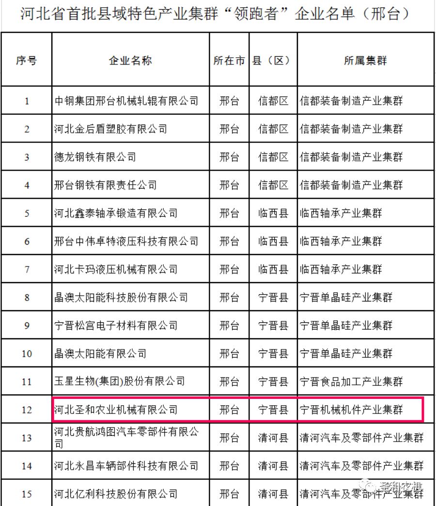 近日,河北省工業(yè)和信息化廳,公布了河北省首批縣域特色產(chǎn)業(yè)集群“領(lǐng)跑者”企業(yè)名單,邢臺市河北圣和農(nóng)業(yè)機(jī)械有限公司、晶澳太陽能、中鋼邢機(jī)等25家企業(yè)入選。