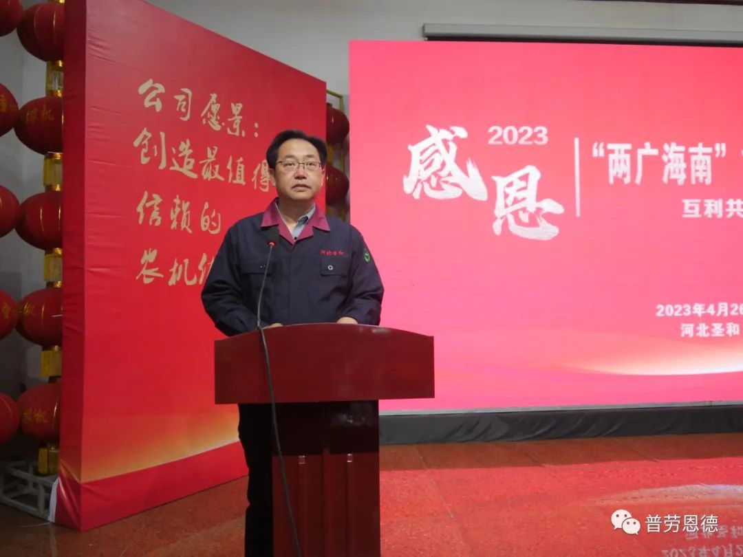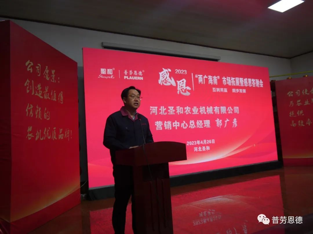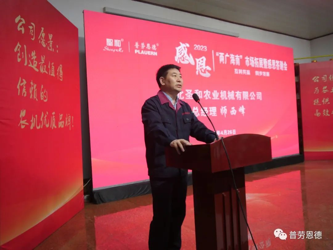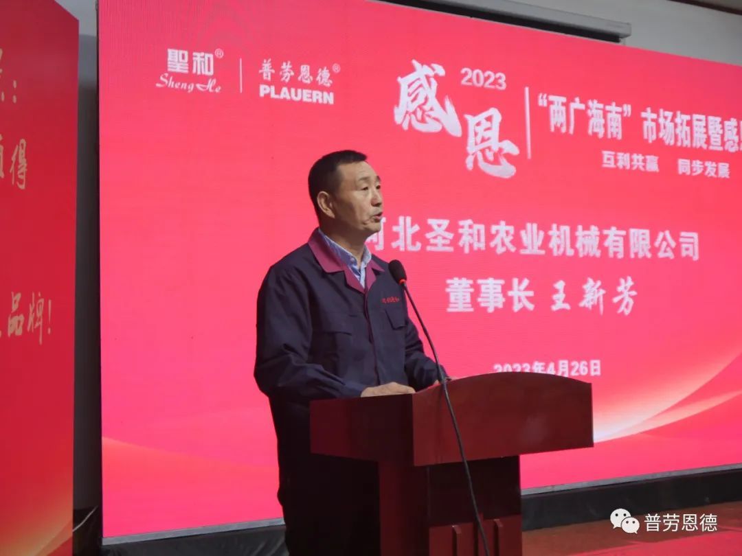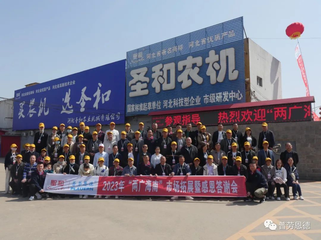 2023年4月26日,圣和公司歡聲笑語,春意盎然。以“互利共贏,同步發(fā)展”為主題的河北圣和“2023年兩廣海南市場拓展暨感恩答謝會(huì)”在河北圣和農(nóng)業(yè)機(jī)械有限公司盛大舉行。100余位來自廣東、廣西、海南的經(jīng)銷商會(huì)師圣和,共襄盛舉。
